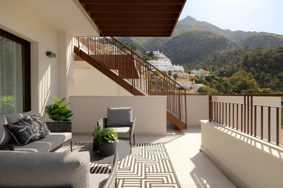El diseño exterior del proyecto destaca por su armoniosa integración con el paisaje natural de la Sierra de las Nieves. Las viviendas están rodeadas de una vegetación autóctona que realza la belleza del entorno, creando un ambiente de paz y tranquilidad. El complejo cuenta con una piscina comunitaria rodeada de jardines, ofreciendo un espacio perfecto para relajarse y disfrutar de la naturaleza. Las amplias terrazas de los apartamentos y los soláriums de los áticos proporcionan vistas despejadas al bosque, permitiendo a los residentes vivir en plena conexión con el entorno natural.