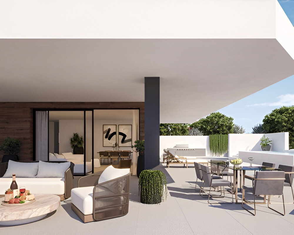 Las viviendas destacan por su amplitud, luminosidad y distribución eficiente. Los apartamentos de planta baja cuentan con jardines privados y piscinas individuales, mientras que los de planta media y los áticos ofrecen terrazas espaciosas para disfrutar del clima mediterráneo. Los interiores están equipados con cocinas modernas, electrodomésticos de alta gama y materiales de primera calidad, garantizando confort y funcionalidad en cada estancia.