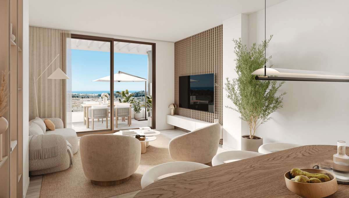 Los interiores de estas viviendas están diseñados para ofrecer comodidad y funcionalidad, con una distribución que maximiza la luz natural y crea ambientes relajantes. Los apartamentos están disponibles en opciones de 2 y 3 dormitorios, cada uno con amplios espacios que se abren hacia terrazas que extienden el área de estar al exterior. Las cocinas, modernas y completamente equipadas, incluyen electrodomésticos de alta calidad, como placa de inducción, frigorífico, lavadora, lavavajillas, campana extractora, horno y microondas, garantizando que cada detalle esté pensado para facilitar la vida diaria. Las estancias han sido diseñadas para ofrecer una sensación de amplitud y conexión con el entorno, creando un hogar acogedor y lleno de luz.