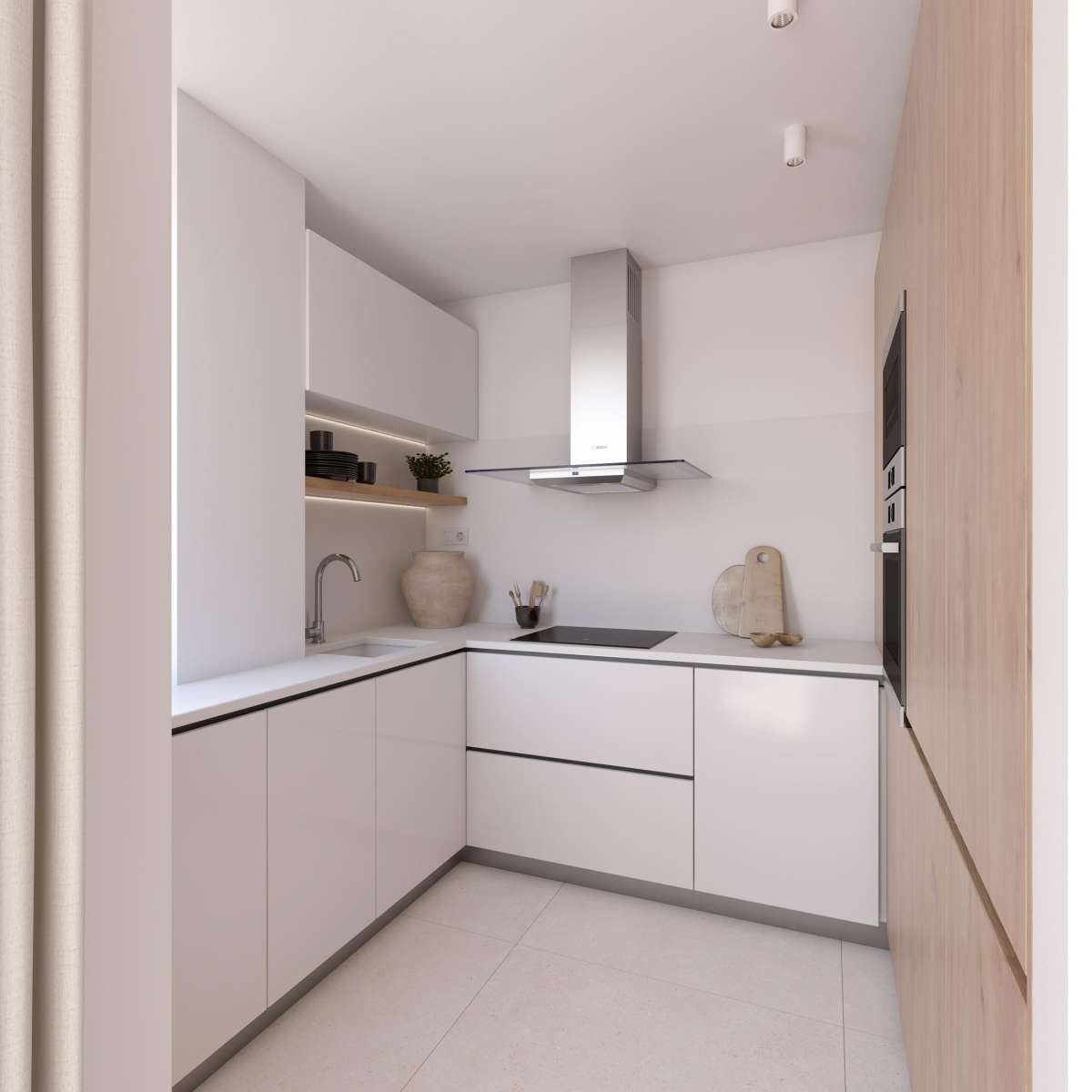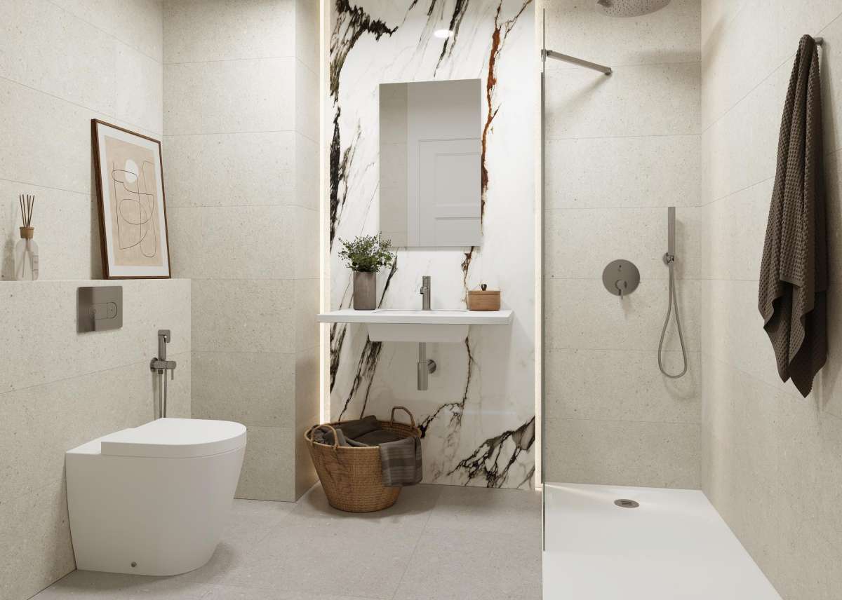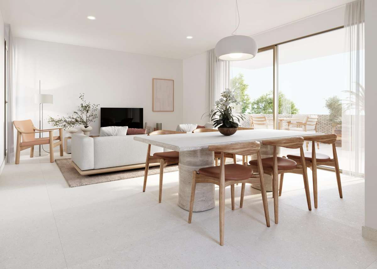 Las viviendas están disponibles en configuraciones de 2 o 3 dormitorios y cuentan con dos baños, cocinas completamente amuebladas y acabados de alta calidad. Los materiales han sido cuidadosamente seleccionados, destacando porcelánicos de Porcelanosa en suelos, revestimientos y baños. Los cerramientos exteriores, de marcas de primera calidad como Strugal, garantizan aislamiento acústico y térmico. En la planta baja, las terrazas conectan directamente con la urbanización, mientras que en los áticos, las viviendas ofrecen acceso directo al solárium desde el interior.