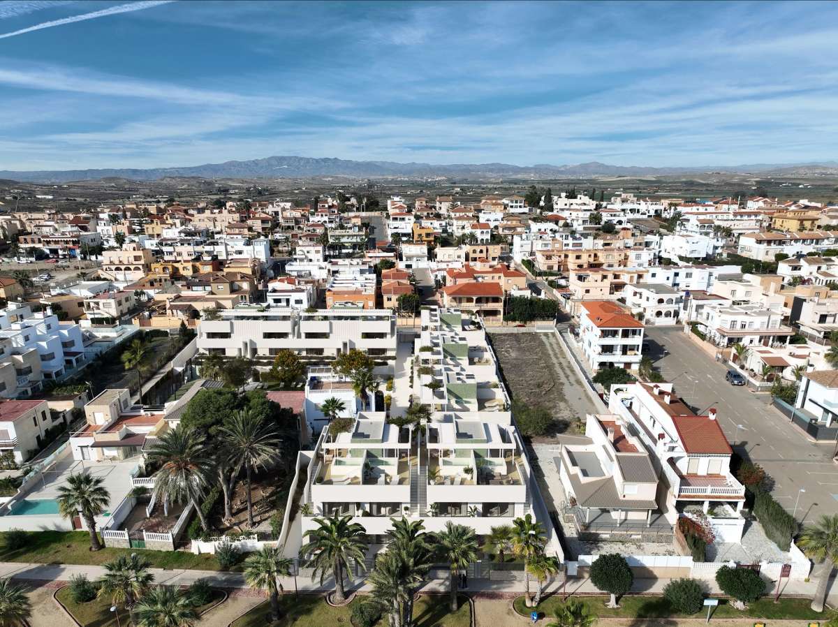 El diseño exterior se integra perfectamente con el entorno mediterráneo, destacando por su arquitectura moderna y funcional. Cada edificio está rodeado de jardines y zonas verdes que complementan una atmósfera relajante. Las viviendas de planta baja cuentan con patios privados con una media de 30 m², mientras que los áticos ofrecen amplios soláriums con piscina privada y pérgola, ideales para disfrutar de las vistas panorámicas y el clima costero.