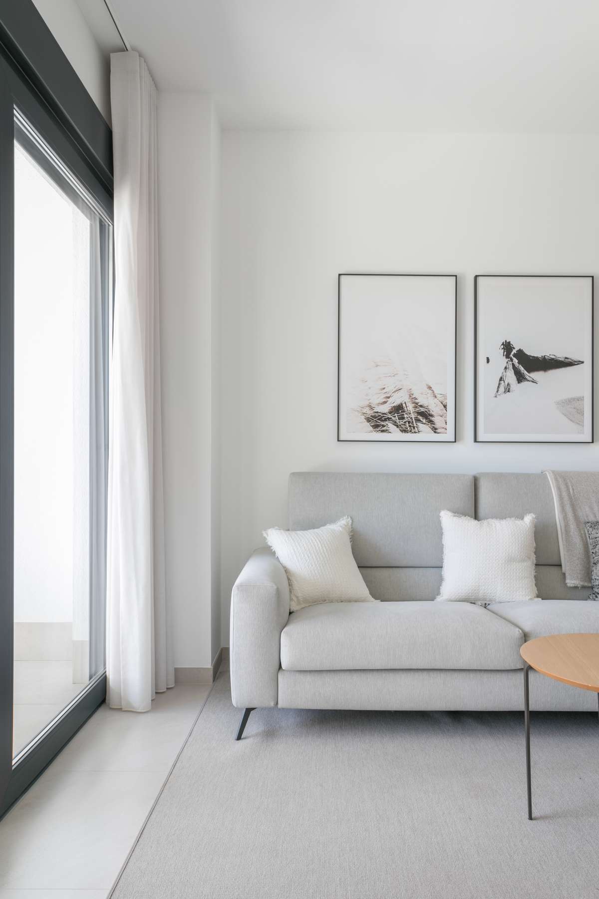 Los interiores de los apartamentos en esta urbanización cerrada están diseñados para ofrecer un espacio habitable moderno y confortable. Con una superficie construida de 78 m² y 68 m² útiles, los apartamentos de 2 dormitorios y 2 baños cuentan con acabados de alta calidad y materiales duraderos. Las cocinas modernas están equipadas con electrodomésticos de última generación y se integran perfectamente con el salón, creando un ambiente abierto y luminoso. Los dormitorios dobles disponen de armarios empotrados que optimizan el espacio de almacenamiento. Los grandes ventanales permiten la entrada de abundante luz natural, realzando la sensación de amplitud y conexión con el exterior. Los áticos de 3 dormitorios y 2 baños ofrecen además un solárium privado, ideal para disfrutar de las vistas panorámicas y el clima mediterráneo.