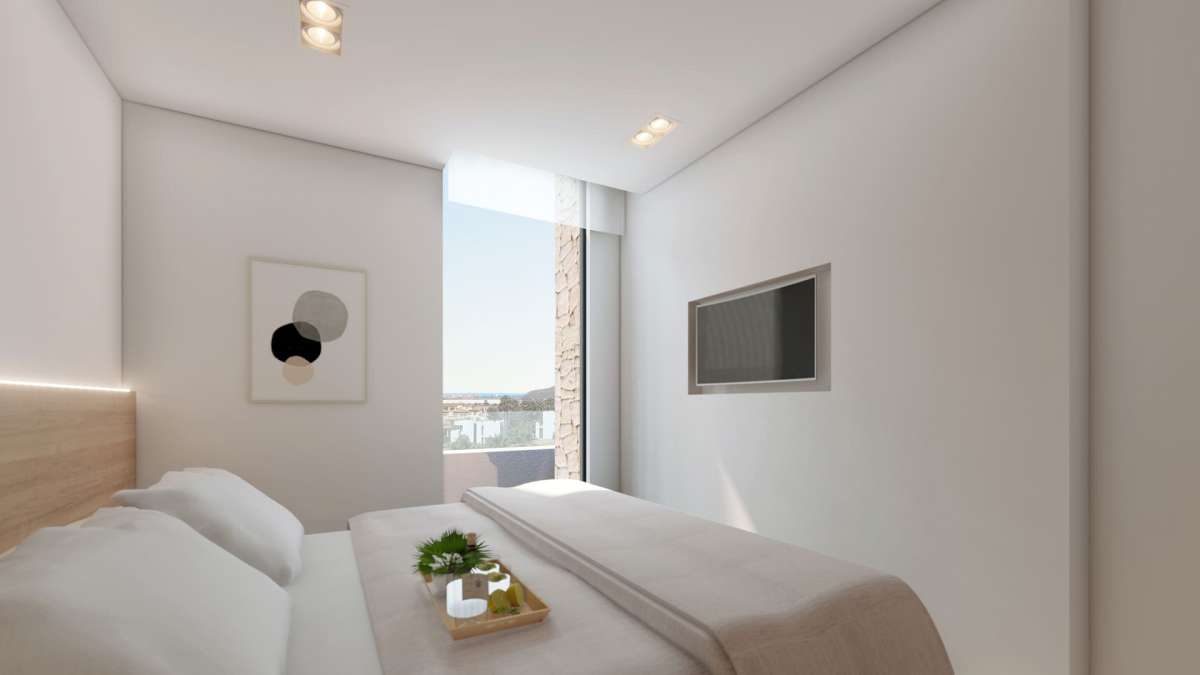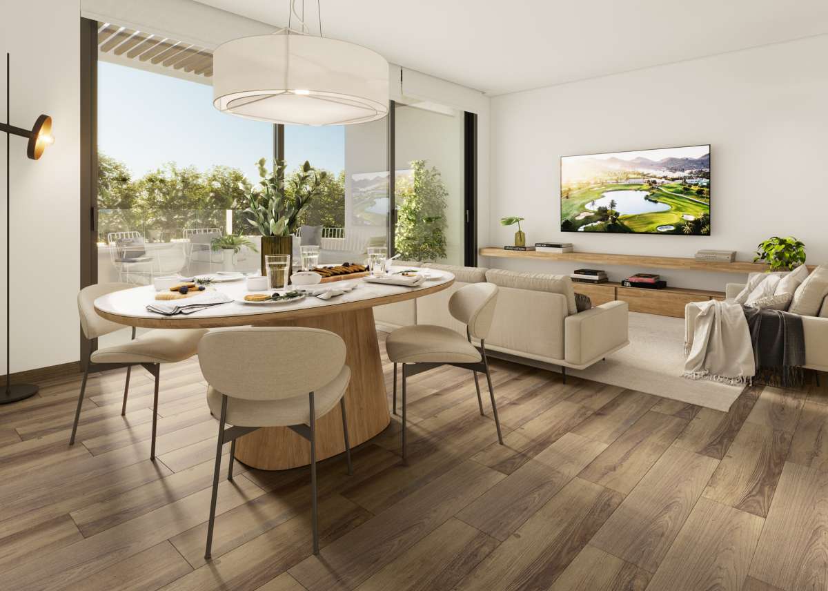 Los interiores de los apartamentos en La Manga Club Resort están diseñados para ofrecer confort y modernidad. Con una superficie construida de 119 m² y 95 m² útiles, los apartamentos disponen de 3 dormitorios dobles y 2 baños completos, todos ellos con acabados de alta calidad. La cocina está equipada con azulejos de gres porcelánico de 60 x 30 cm y los baños cuentan con alicatado de gres porcelánico sobre superficies de cartón yeso laminado. Los armarios empotrados prefabricados con puertas correderas ofrecen amplio espacio de almacenamiento, mientras que las puertas interiores prelacadas en blanco con ranuras horizontales añaden un toque elegante. El sistema de calefacción por aerotermia, aire acondicionado y agua caliente sanitaria, junto con los fancoils de alta eficiencia y la ventilación controlada mecánicamente DOUBLE FLOW, aseguran un ambiente confortable y eficiente en todo momento.