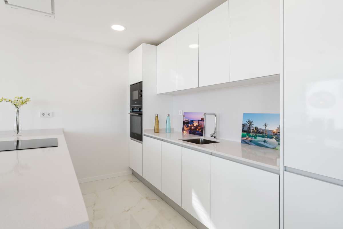 El complejo destaca por su diseño contemporáneo y elegante, perfectamente integrado con el entorno costero de Estepona. Las viviendas de planta baja cuentan con jardines privados, ideales para disfrutar del aire libre en privacidad. Los pisos intermedios ofrecen amplias terrazas, mientras que los áticos disponen de solariums con vistas espectaculares al mar. Las zonas comunes incluyen una gran piscina infinita con tumbonas y jardines bien cuidados, proporcionando un espacio perfecto para el ocio y la relajación. La proximidad a la playa de Arroyo Vaquero, a solo 300 metros, añade un valor incomparable a esta exclusiva urbanización.