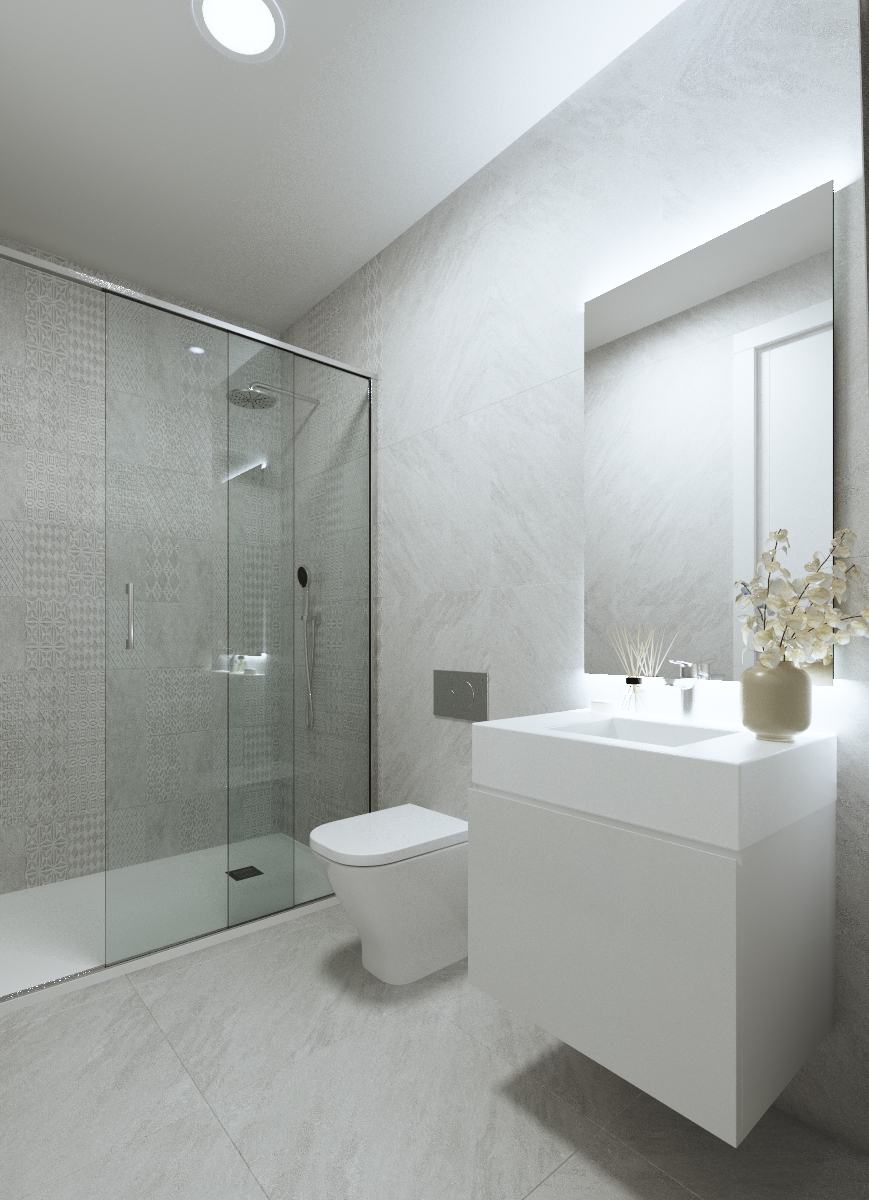 El diseño interior de los apartamentos se centra en la comodidad y la funcionalidad, con un salón-cocina-comedor abierto de 26.80m² que maximiza el espacio y la luz natural. Los dos dormitorios dobles están diseñados para ofrecer un ambiente acogedor y confortable. Los baños, completamente equipados, presentan acabados modernos y de alta calidad. La preinstalación de aire acondicionado asegura que cada apartamento esté preparado para adaptarse a las necesidades de sus residentes. La tecnología de video portero automático proporciona una capa adicional de seguridad y comodidad.