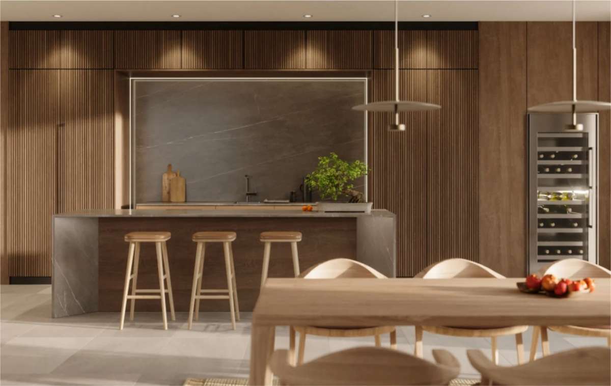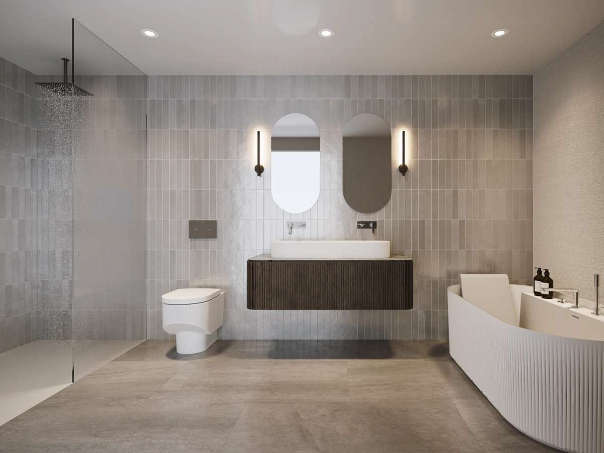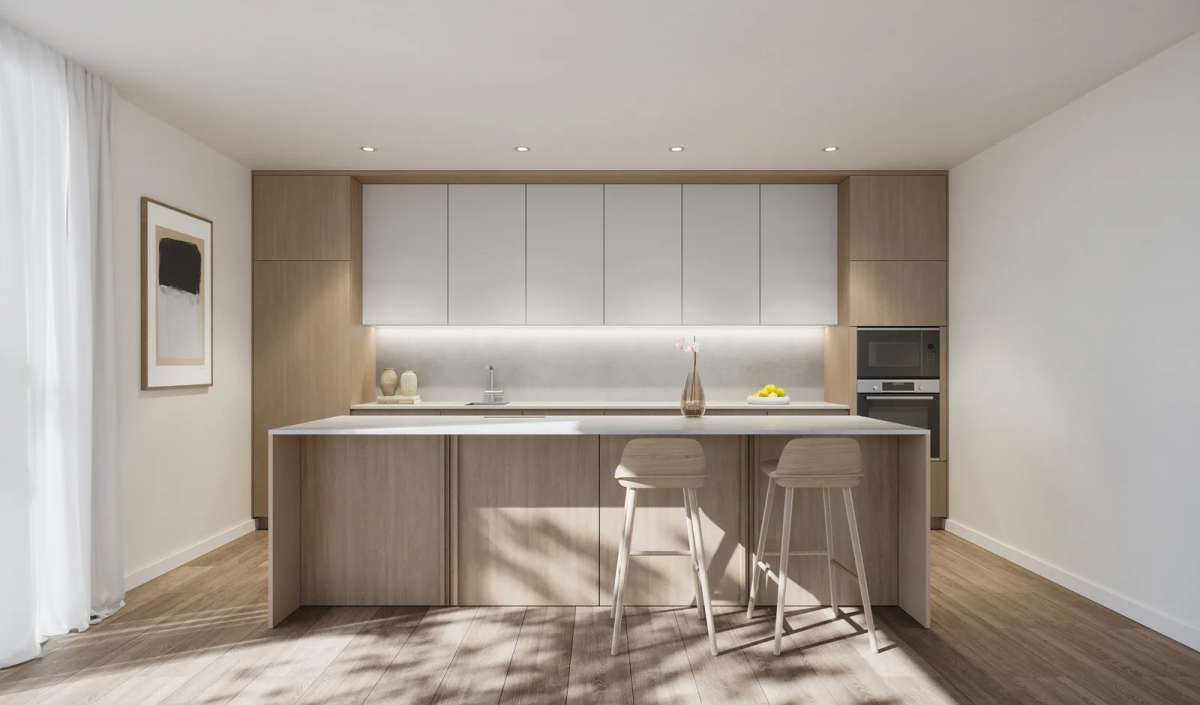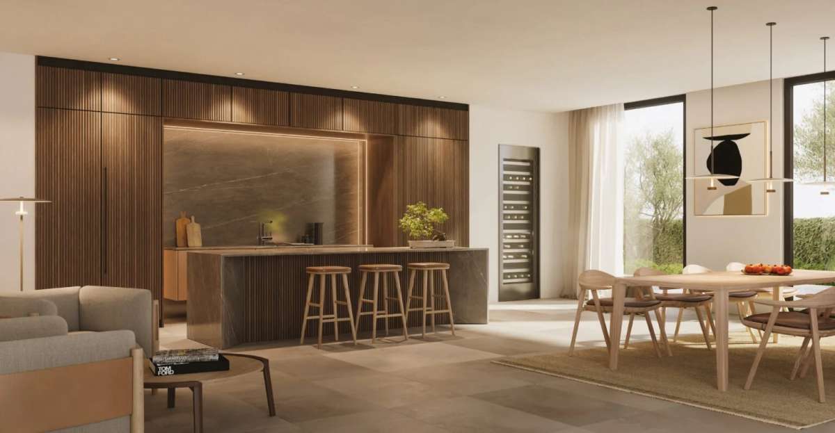 Las viviendas presentan cocinas modernas y funcionales con acabados mediterráneos o cosmopolitas, con superficies de alta calidad y electrodomésticos integrados para mantener un diseño limpio y despejado. Se utilizan materiales premium como Laminam® Italia para encimeras, que ofrecen resistencia y fácil mantenimiento. Los interiores están equipados con accesorios y acabados de marcas de alta gama, asegurando durabilidad, versatilidad y belleza en cada detalle.
