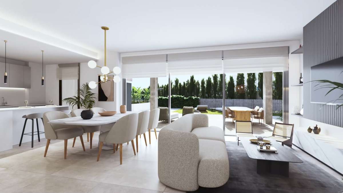 Los interiores de las viviendas destacan por su diseño moderno y funcional, con espacios abiertos que aprovechan al máximo la luz natural. Los grandes ventanales conectan el interior con las terrazas, creando una sensación de continuidad y amplitud. Los dormitorios dobles ofrecen comodidad y privacidad, mientras que las cocinas están equipadas con electrodomésticos de alta gama y acabados de calidad. El sistema de aire acondicionado asegura un ambiente confortable durante todo el año. Las opciones de personalización permiten a los propietarios adaptar los espacios a sus gustos y necesidades, haciendo de cada vivienda un hogar único.