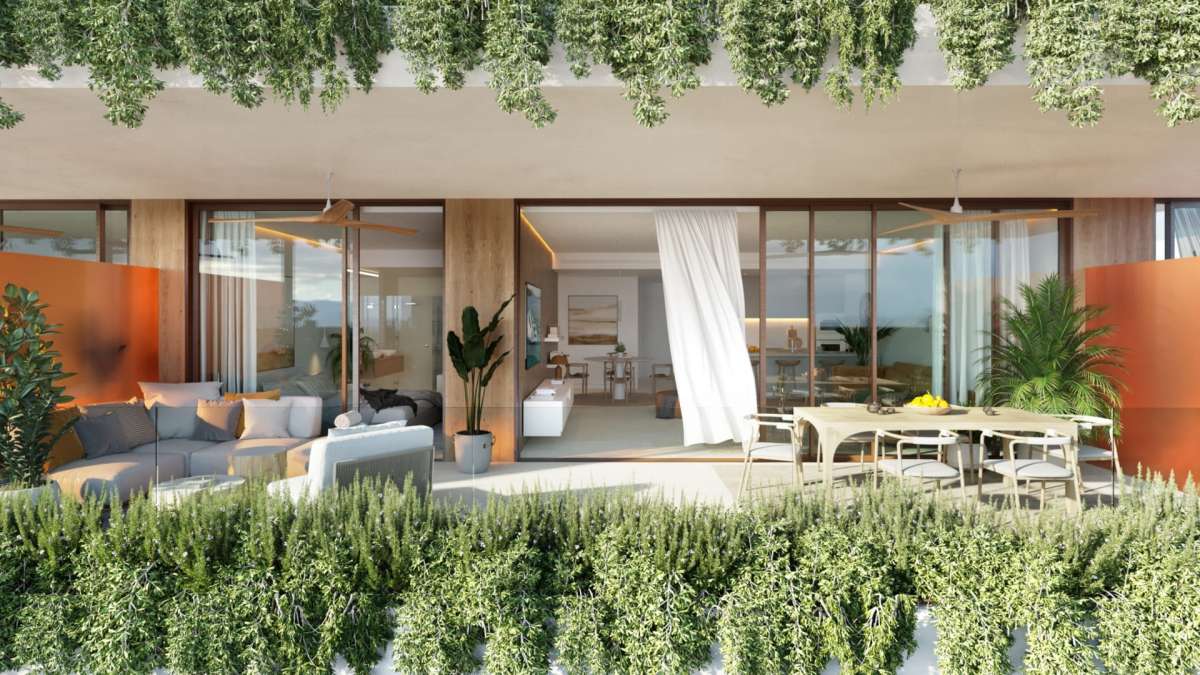 El exterior se caracteriza por un diseño contemporáneo que armoniza con el entorno natural. Las viviendas, orientadas al sur y suroeste, han sido concebidas para maximizar la entrada de luz natural, creando espacios donde se disfrutan espectaculares vistas al atardecer. Las Garden Villas cuentan con amplias terrazas privadas y jardines de hasta 227 m², mientras que las Sky Villas ofrecen solariums con acabados de alta gama y vistas exclusivas al mar. El conjunto, rodeado de una frondosa vegetación mediterránea, incluye más de 20,000 m² de zonas ajardinadas y plantas aromáticas que invitan a la tranquilidad y el contacto con la naturaleza.