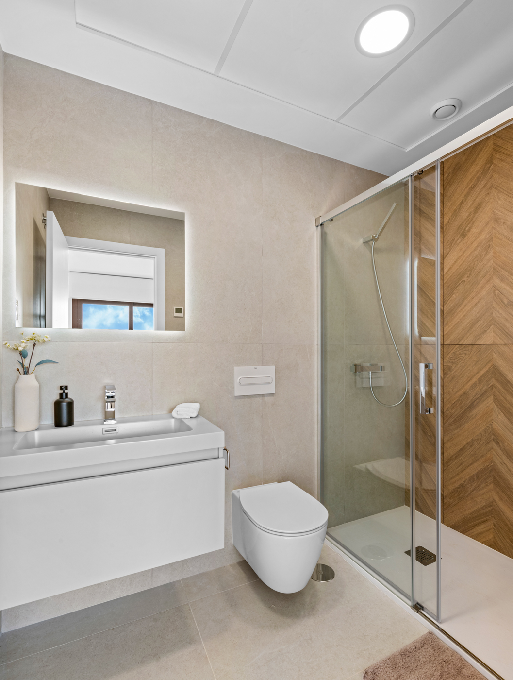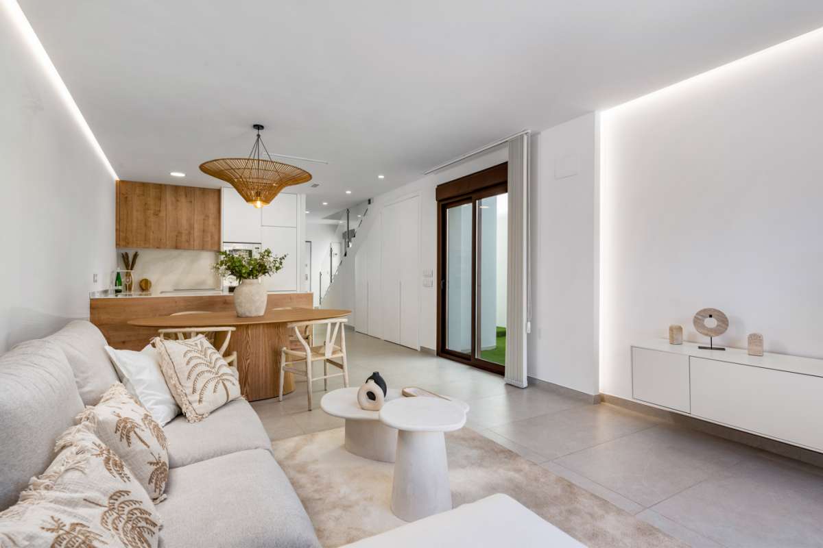 El interior de las villas está diseñado para ofrecer el máximo confort y funcionalidad. En la planta baja, se encuentra un luminoso salón-comedor con grandes ventanales que se comunican directamente con el jardín y la piscina, creando un espacio abierto y acogedor. La cocina moderna está integrada en el salón, equipada con electrodomésticos de alta calidad y acabados contemporáneos. Esta planta también cuenta con un dormitorio doble y un baño completo, ideal para invitados o como dormitorio adicional. En la primera planta, se encuentran dos dormitorios dobles, cada uno con su baño en suite, proporcionando privacidad y confort a los residentes. Un fantástico solárium en la planta cubierta completa el conjunto, ofreciendo un espacio perfecto para disfrutar de momentos de tranquilidad y las vistas panorámicas.