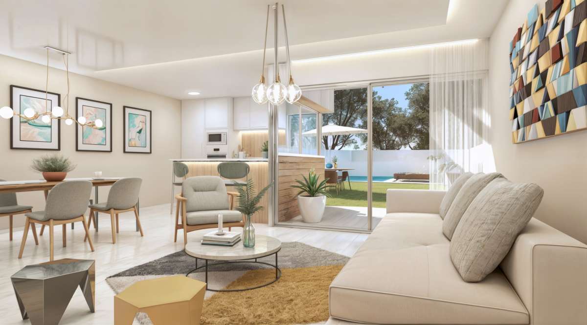 Salón comedor luminoso, con ventanales que conectan el interior con el jardín, aportando una gran sensación de amplitud.