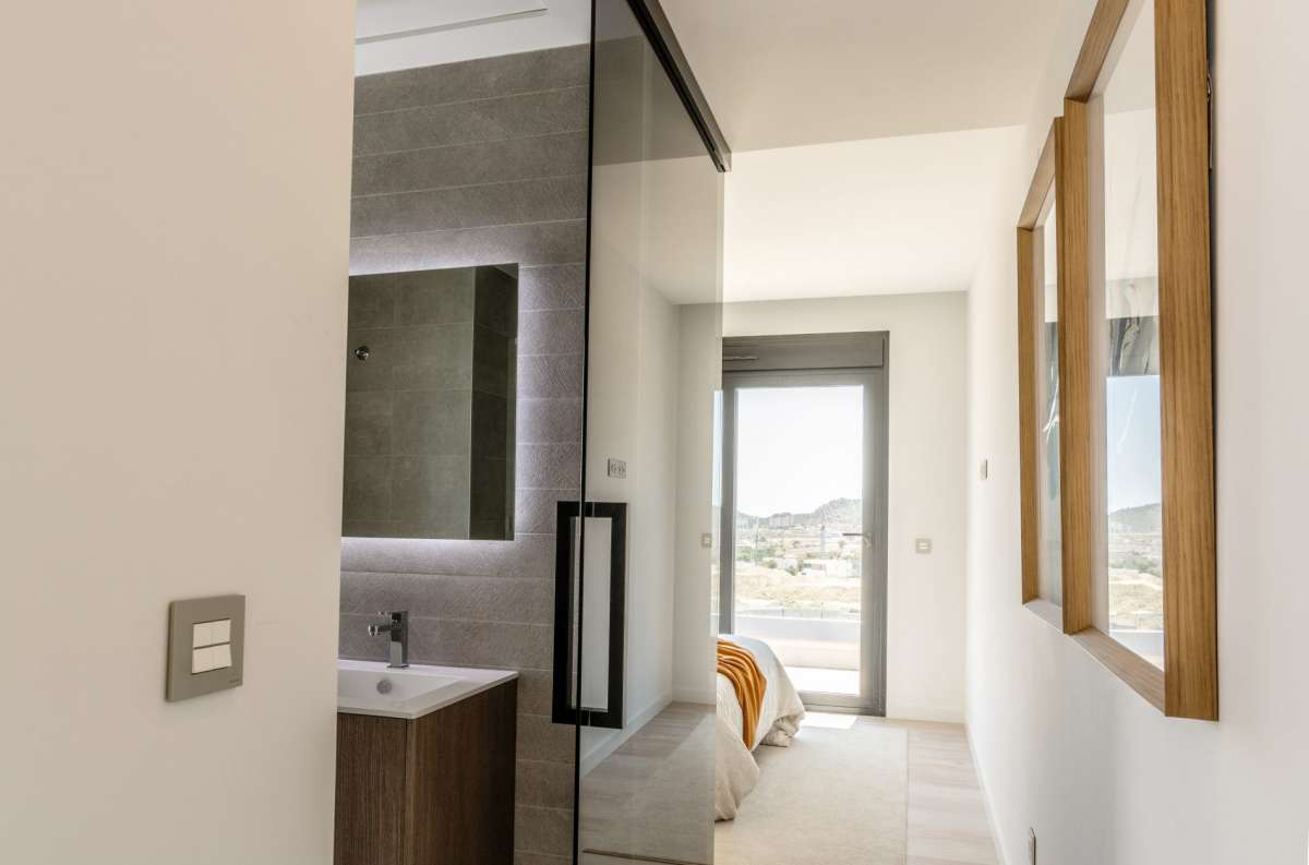 Distribuidas en dos plantas, las villas presentan un diseño funcional y luminoso. La planta baja alberga un amplio salón-comedor con grandes ventanales que se abren directamente al jardín y a la piscina, creando una fluida integración entre interior y exterior. En esta misma planta se encuentra un dormitorio con baño completo, perfecto para invitados o para quienes prefieren evitar el uso de escaleras. La planta superior dispone de dos dormitorios tipo suite, ambos con baño privado y acceso directo a una soleada terraza, ideal para disfrutar del clima y las vistas. Además, cada villa incluye una casa de invitados independiente en una sola planta, con dormitorio, baño completo y terraza privada con vistas al jardín, que puede utilizarse también como espacio de trabajo o zona de relax.