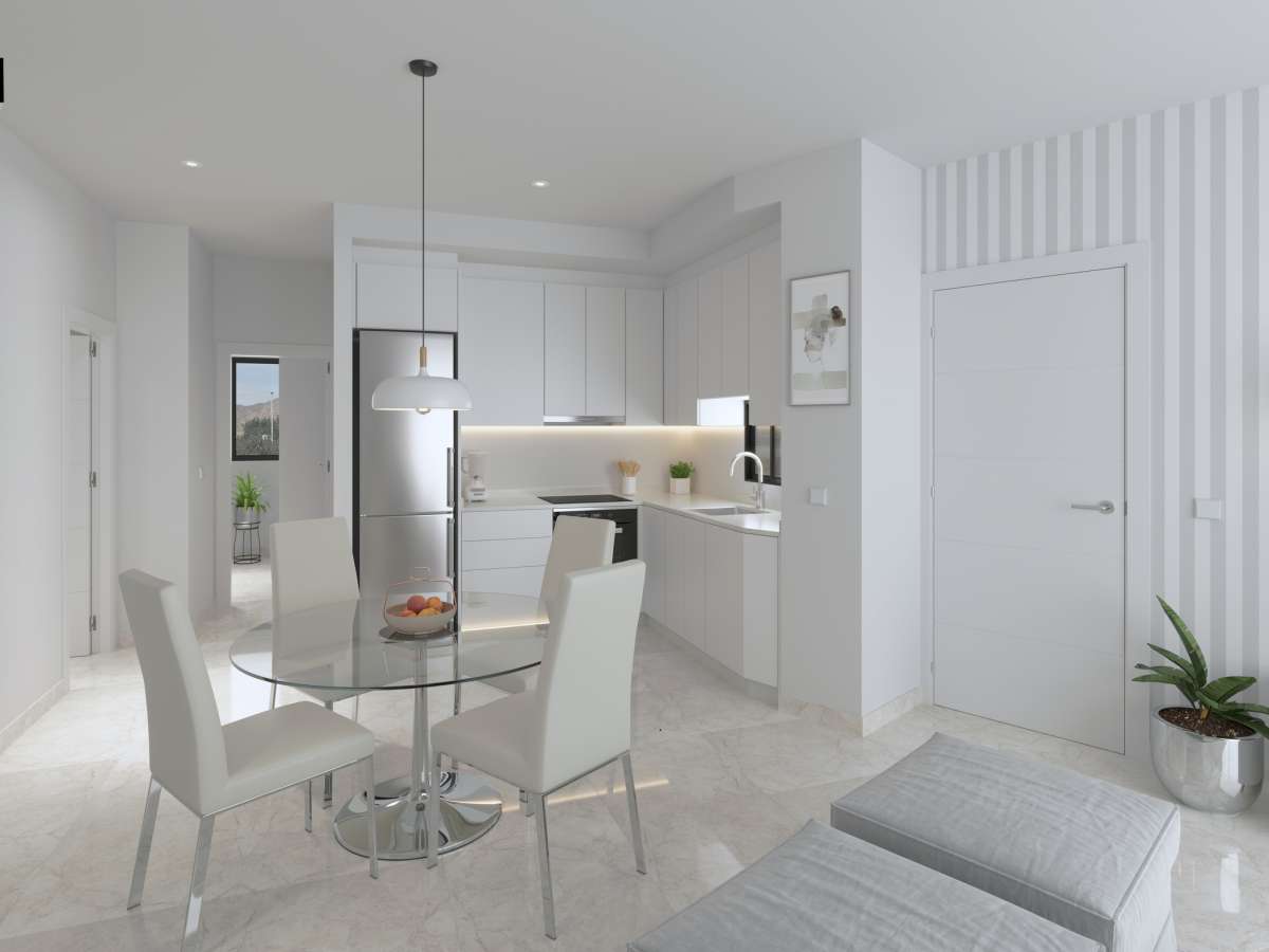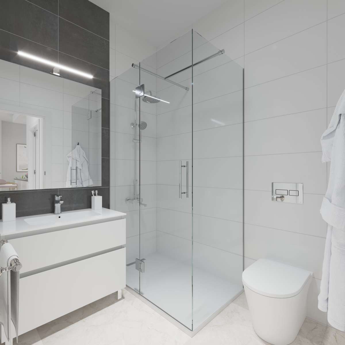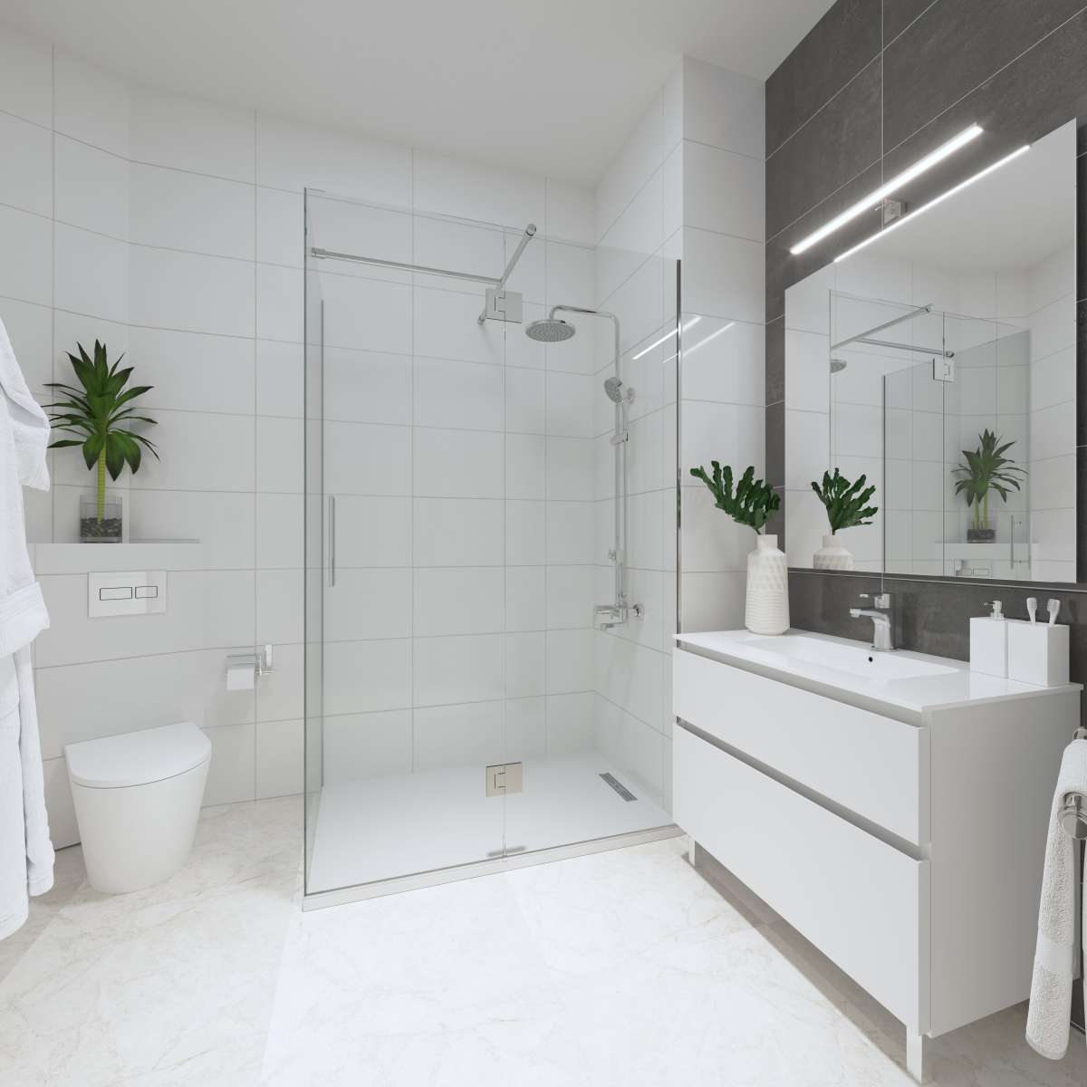 Viviendas de 2 y 3 dormitorios, salón comedor, cocina amueblada con electrodomésticos, 2 baños, amplias terrazas, magníficos jardines y solárium en las plantas altas. Las viviendas se entregan totalmente amuebladas, con la iluminación y decoradas, con suelo radiante en los cuartos de baño, aire acondicionado (frío–calor), armarios empotrados, lavadero, puerta acorazada de acceso a la vivienda, calidades de lujo.