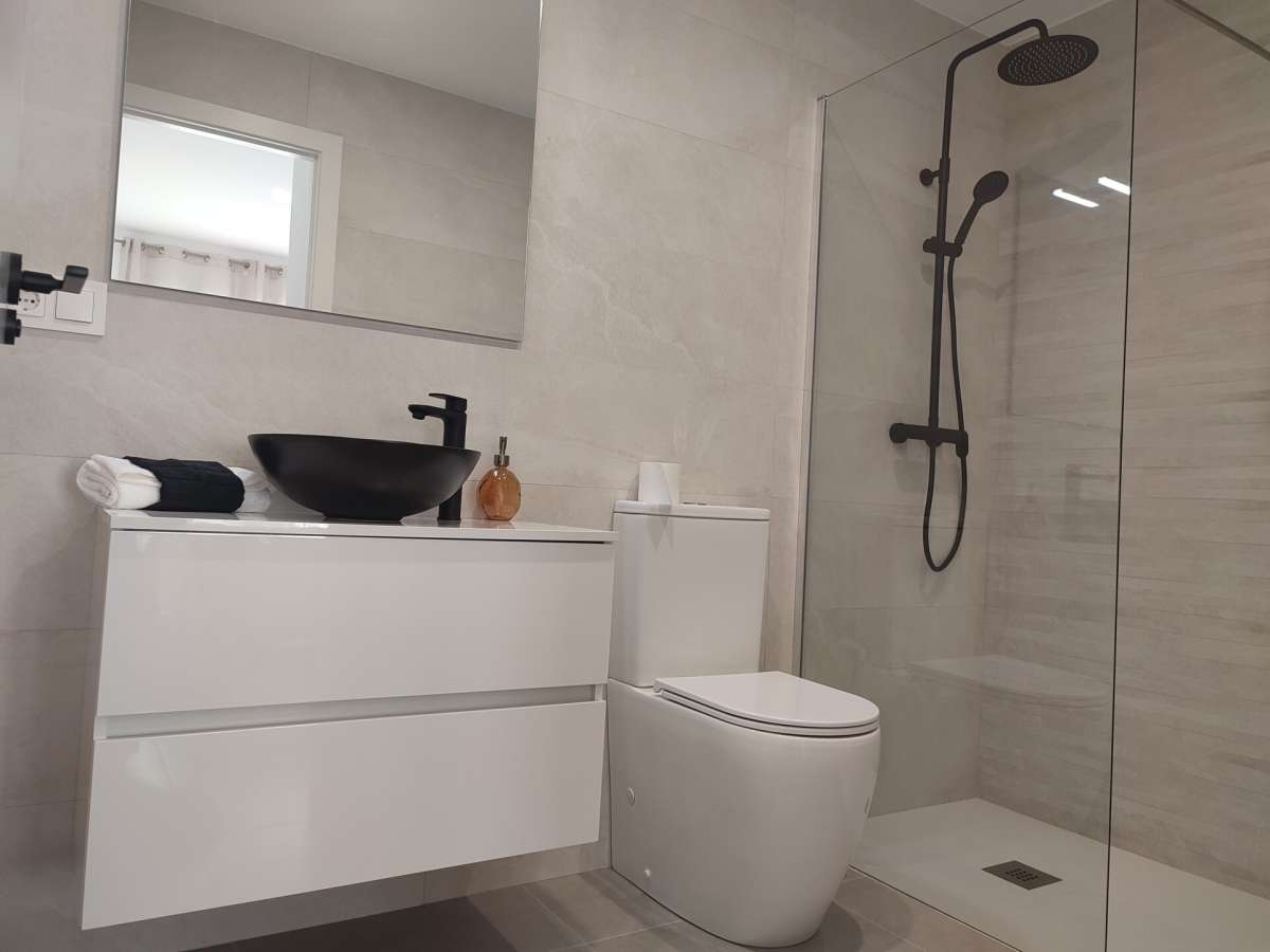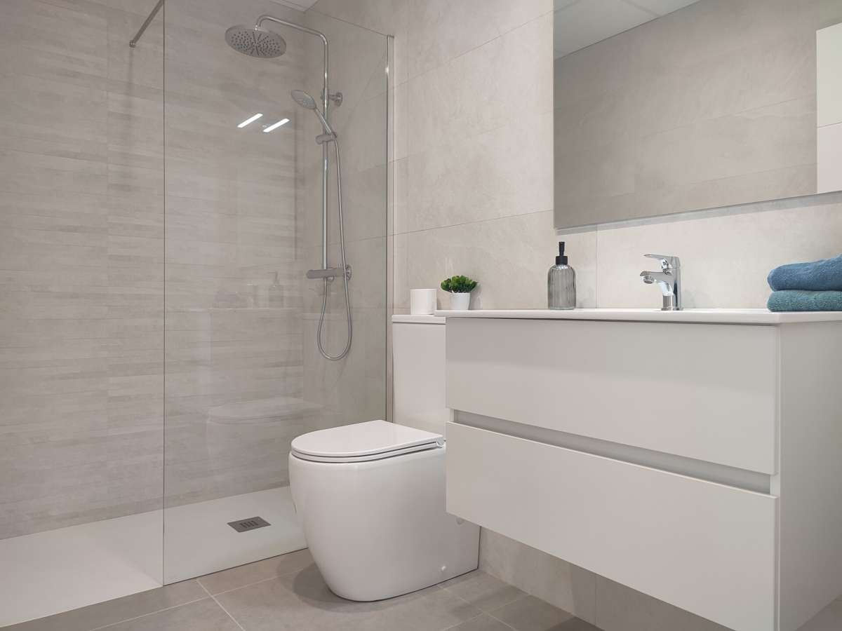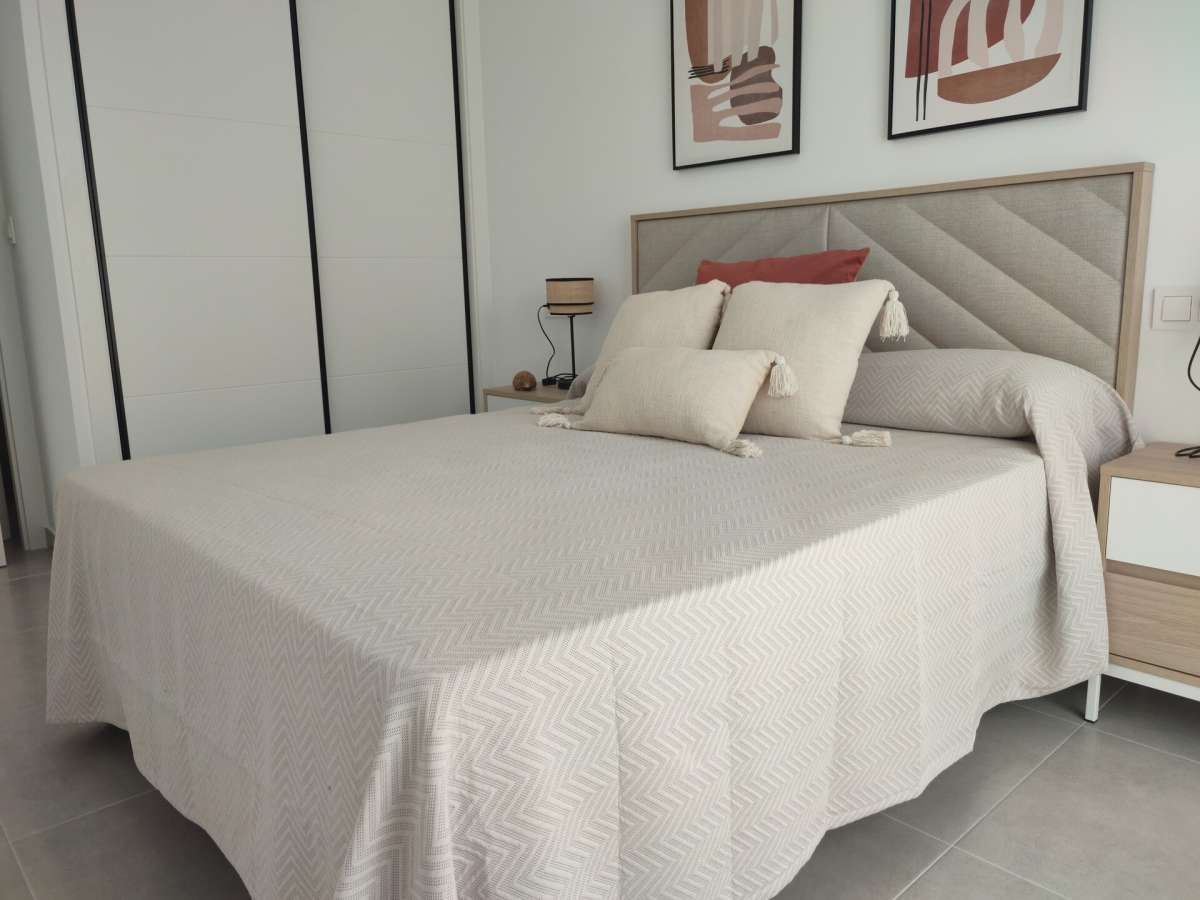 Los interiores de las villas han sido diseñados para maximizar el espacio y la luz, con un concepto de planta abierta que conecta el salón-comedor con la cocina totalmente equipada. Esta última incluye electrodomésticos de alta gama integrados, como horno, frigorífico, lavavajillas, vitrocerámica y campana extractora, además de una elegante isla que amplía la zona de trabajo. Los tres dormitorios cuentan con armarios empotrados forrados con cajones, y los dos baños están completamente equipados con muebles de lavabo, WC, espejo y duchas con mampara. La preinstalación de aire acondicionado por conductos asegura que las viviendas estén preparadas para proporcionar el máximo confort durante todo el año.