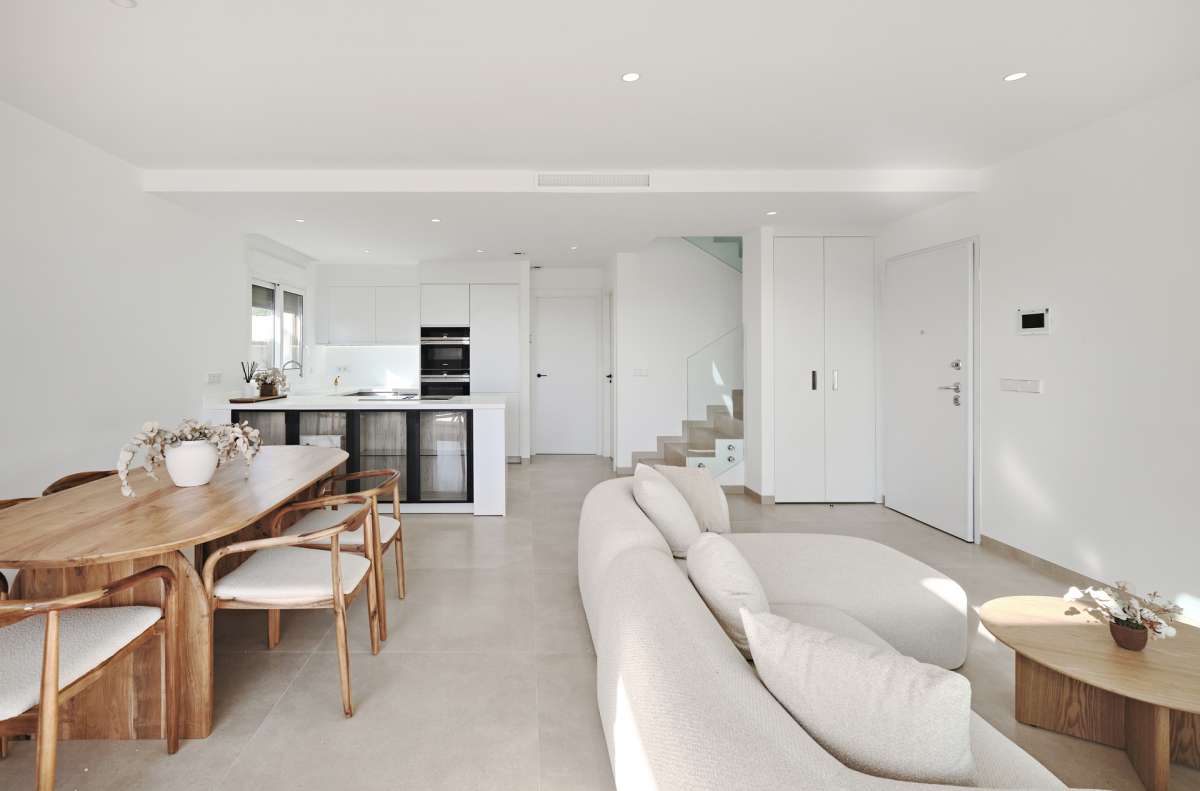 Con 140 m² construidos, las viviendas se distribuyen en dos plantas e incluyen tres dormitorios dobles con armarios empotrados, tres baños completos, un aseo adicional y una moderna cocina americana integrada en un salón amplio y abierto. Las villas se entregan completamente equipadas con electrodomésticos, aire acondicionado, sistema de iluminación interior y exterior, todo incluido en el precio. Mientras están en fase de construcción, los espacios pueden adaptarse al gusto del cliente, lo que permite crear un hogar verdaderamente a medida.