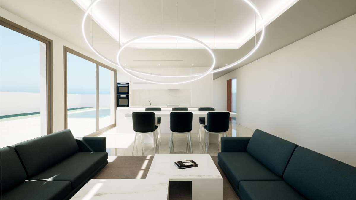 El interior de la villa ha sido diseñado con un estilo moderno y funcional, priorizando la amplitud, la luz natural y la comodidad: