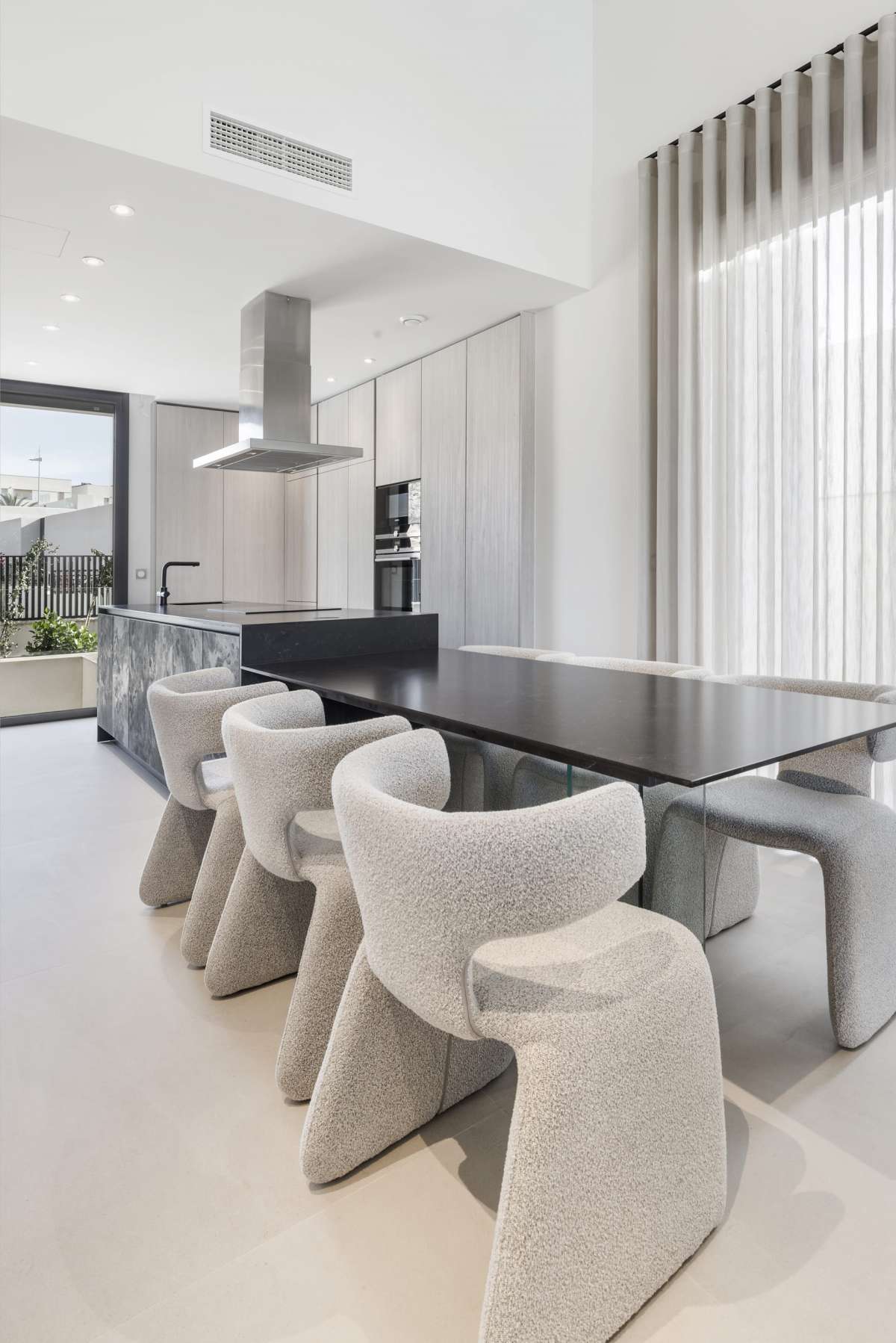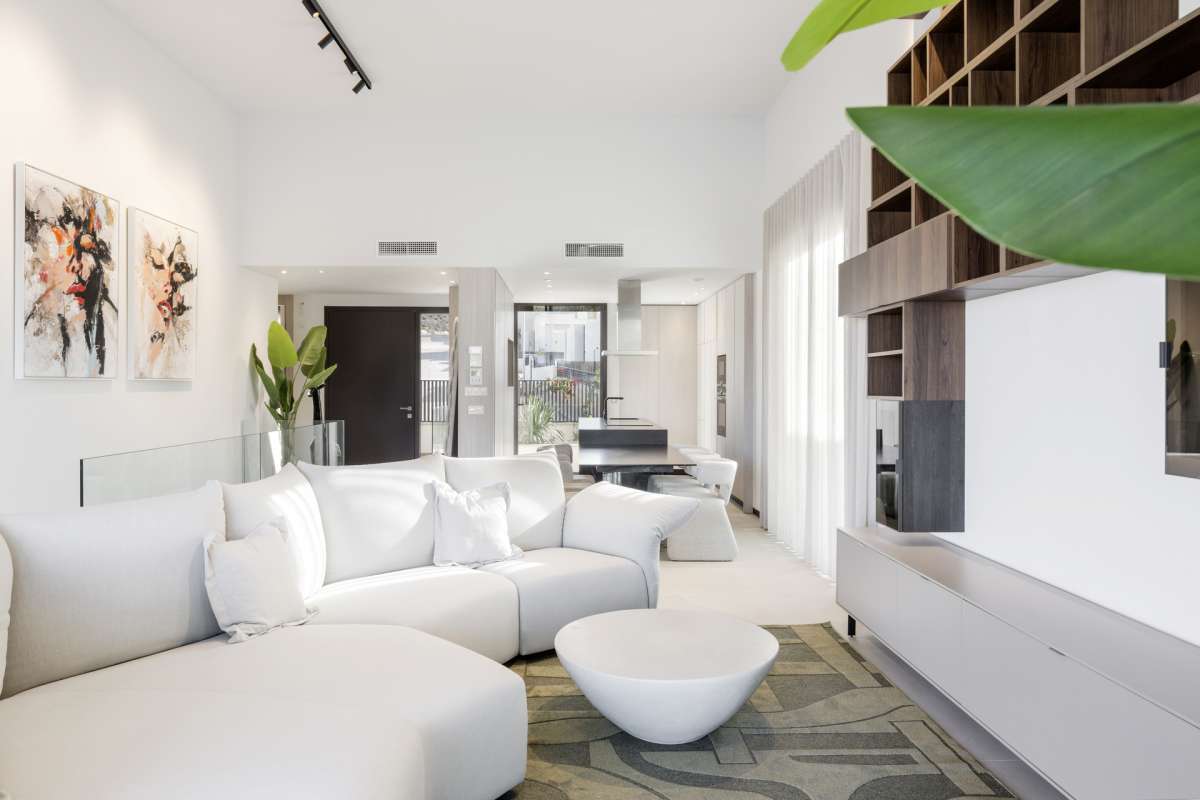 El interior de la villa está diseñado para ofrecer el máximo confort y lujo. Con una superficie construida de 203 m² y 175 m² útiles, la villa cuenta con 3 dormitorios dobles, todos con acabados de alta calidad. La suite principal incluye un vestidor y un baño en suite, proporcionando un espacio privado y elegante. Los 3 baños están equipados con modernos accesorios y calefacción por suelo radiante, asegurando una temperatura agradable en todas las estaciones. La cocina americana, equipada con electrodomésticos de última generación, se integra perfectamente con el salón, creando un espacio abierto y luminoso. Los grandes ventanales permiten la entrada de abundante luz natural y ofrecen vistas espectaculares al campo de golf. Además, la villa está equipada con un avanzado sistema domótico que facilita el control de las funciones del hogar.
