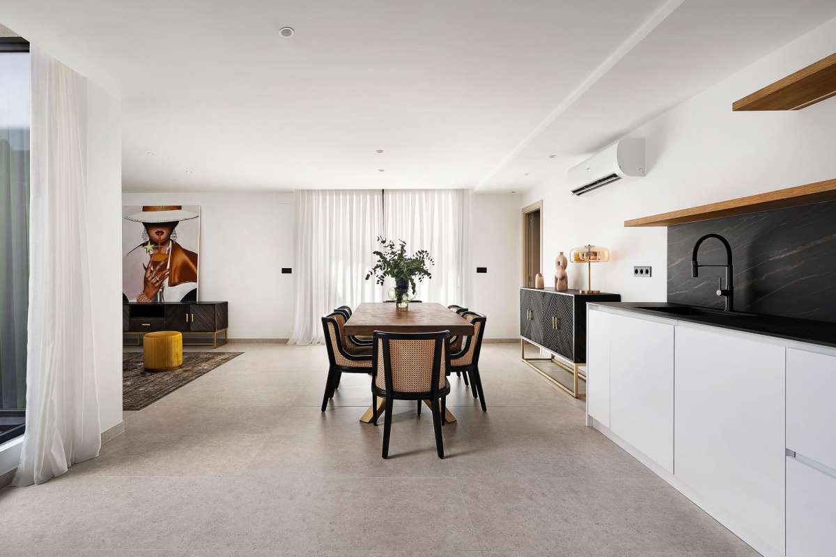 Planta Baja: Incluye un dormitorio doble, un baño completo, una cocina de diseño moderno con isla y equipada con electrodomésticos Miele de alta gama, un comedor y un salón que conecta con el porche y el jardín.