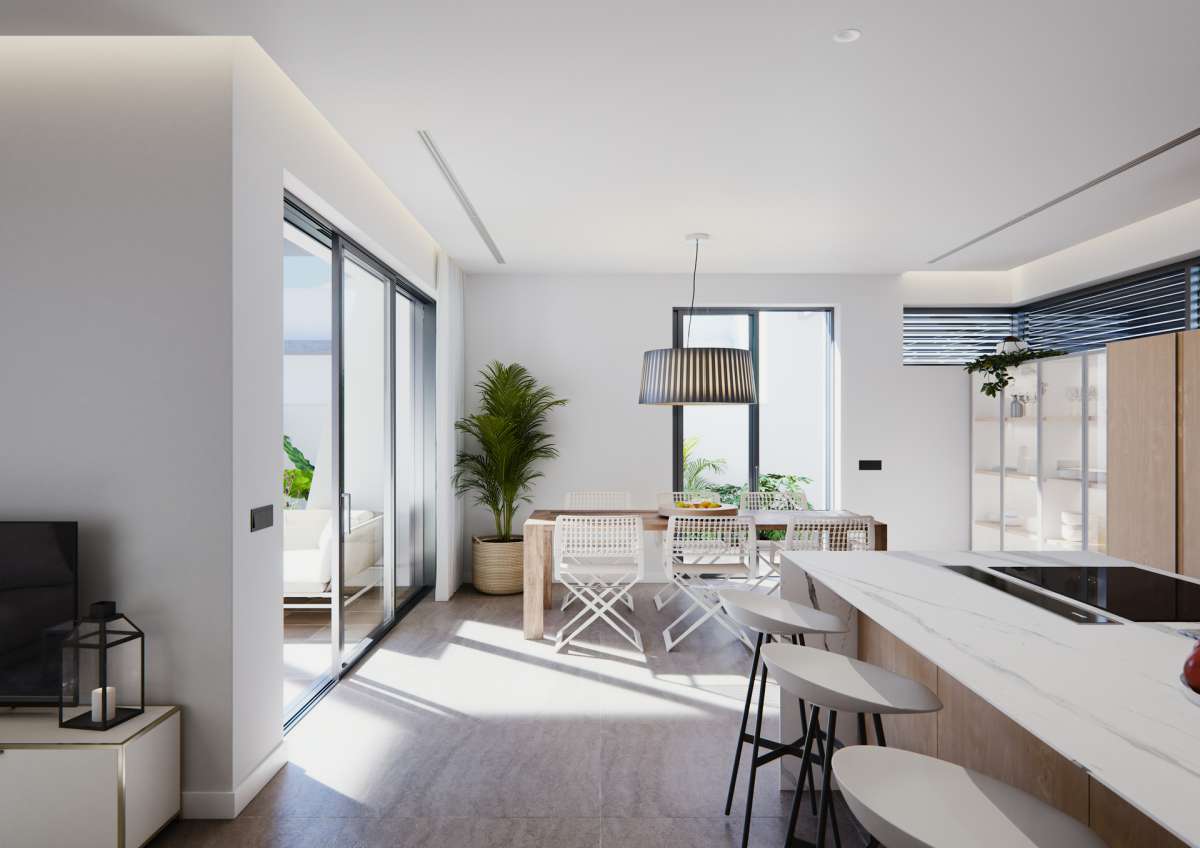 En su interior, cada villa ha sido pensada para crear un microclima confortable durante todo el año, gracias a su óptimo aislamiento térmico y acústico. Disponen de tres dormitorios amplios, todos con armarios empotrados, y cuatro baños completos, incluyendo un dormitorio principal con vestidor y baño en suite. La cocina, moderna y de concepto abierto, está completamente amueblada y equipada con electrodomésticos de alta gama integrados, y se conecta con un salón luminoso gracias a grandes ventanales con acceso directo a la piscina y el jardín. Los baños incluyen aparatos suspendidos, grifería termostática y acabados de primera calidad.